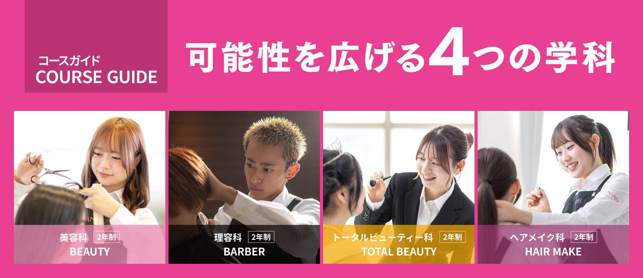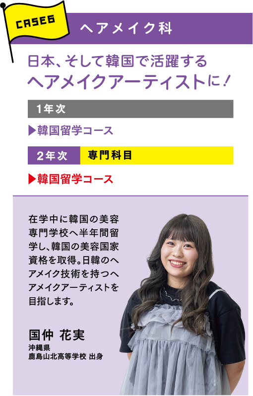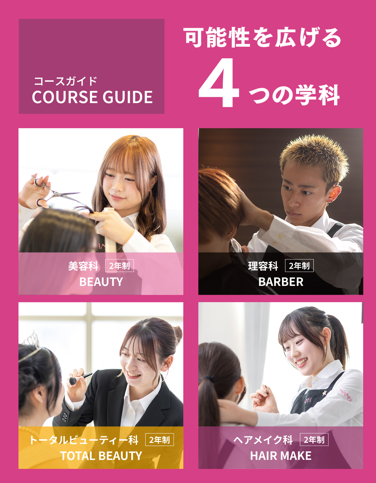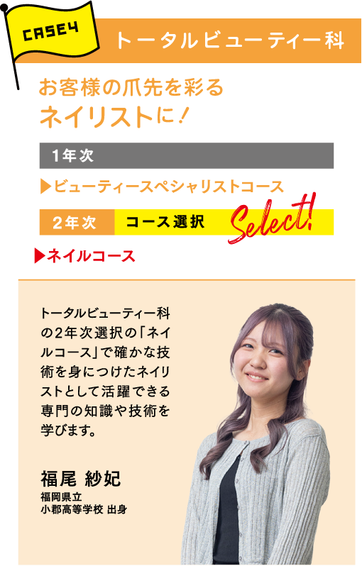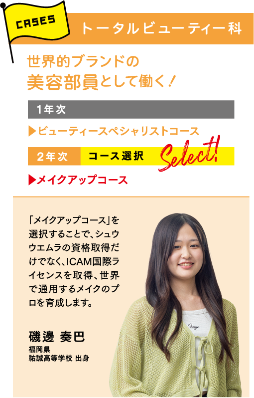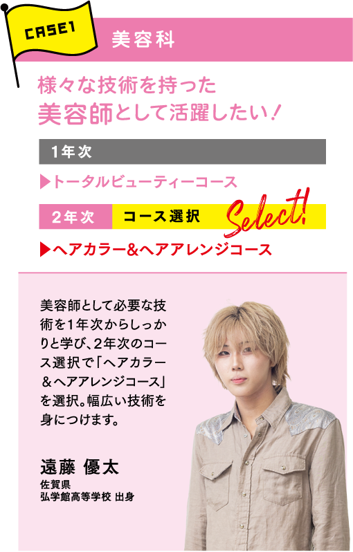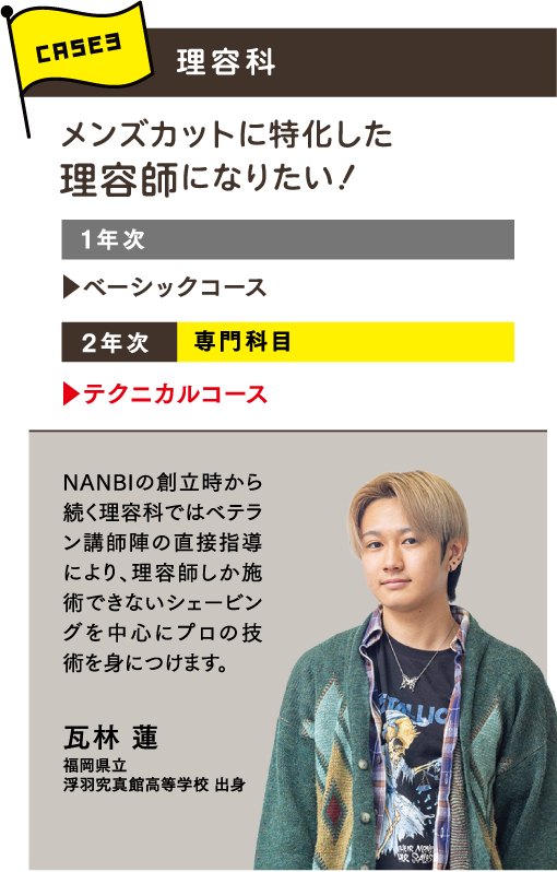 NANBIでは、目指す職業や興味のあるジャンルに合わせて学べるように多彩な学科を設けています。まずは「どんな仕事をしたいか、どんな資格を取りたいか」で学科を選択。さらに、より深く学びたいことをコース別・専門別授業で学べます。「美容のプロ」としての強みをつくることができるカリキュラムが特徴です。