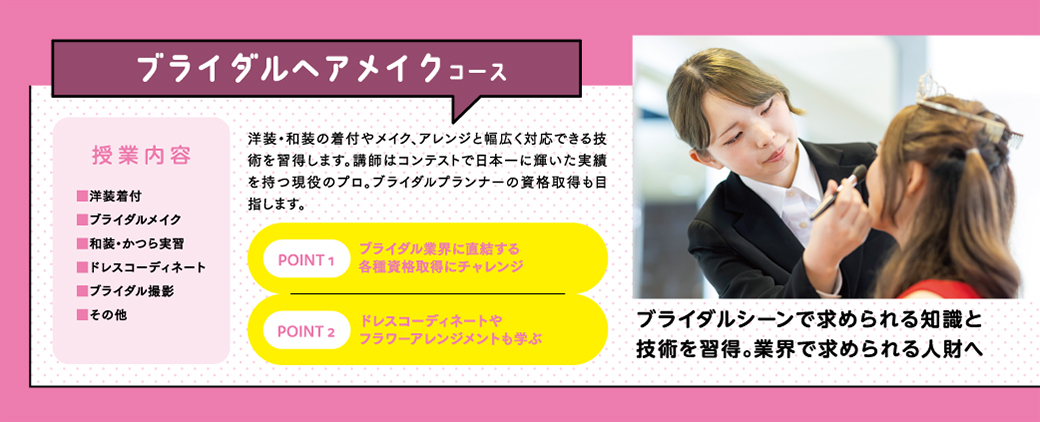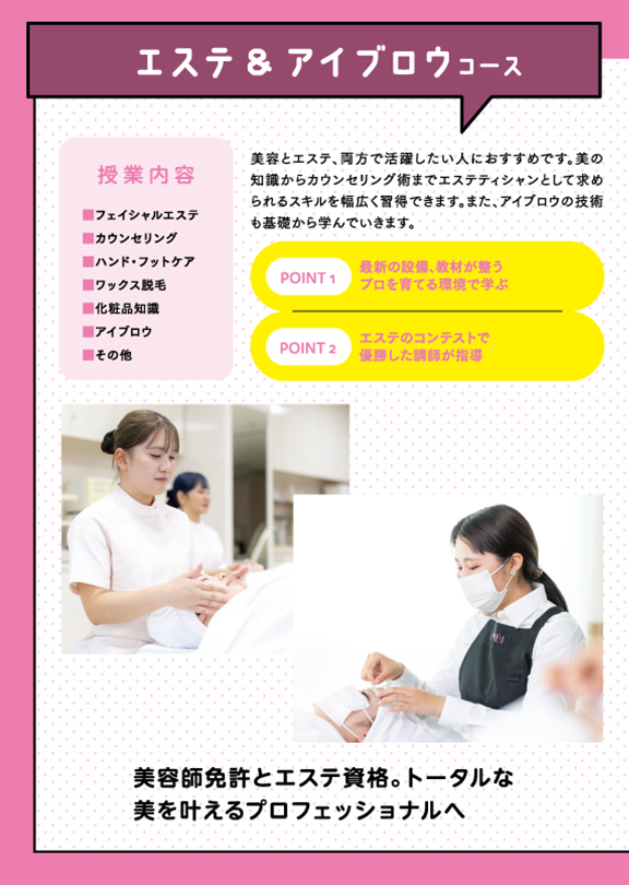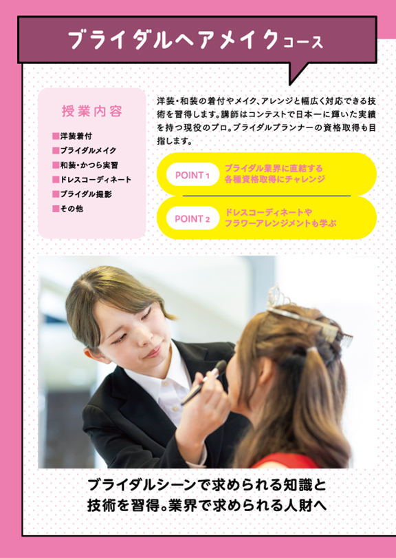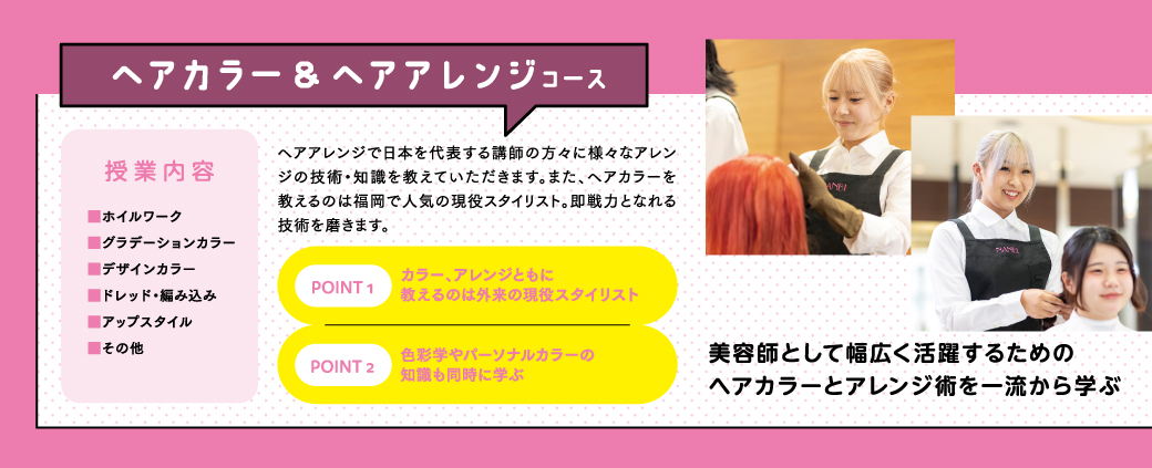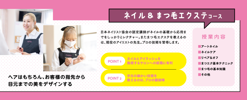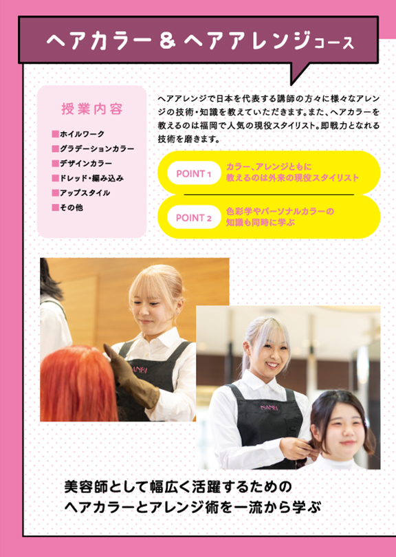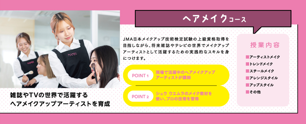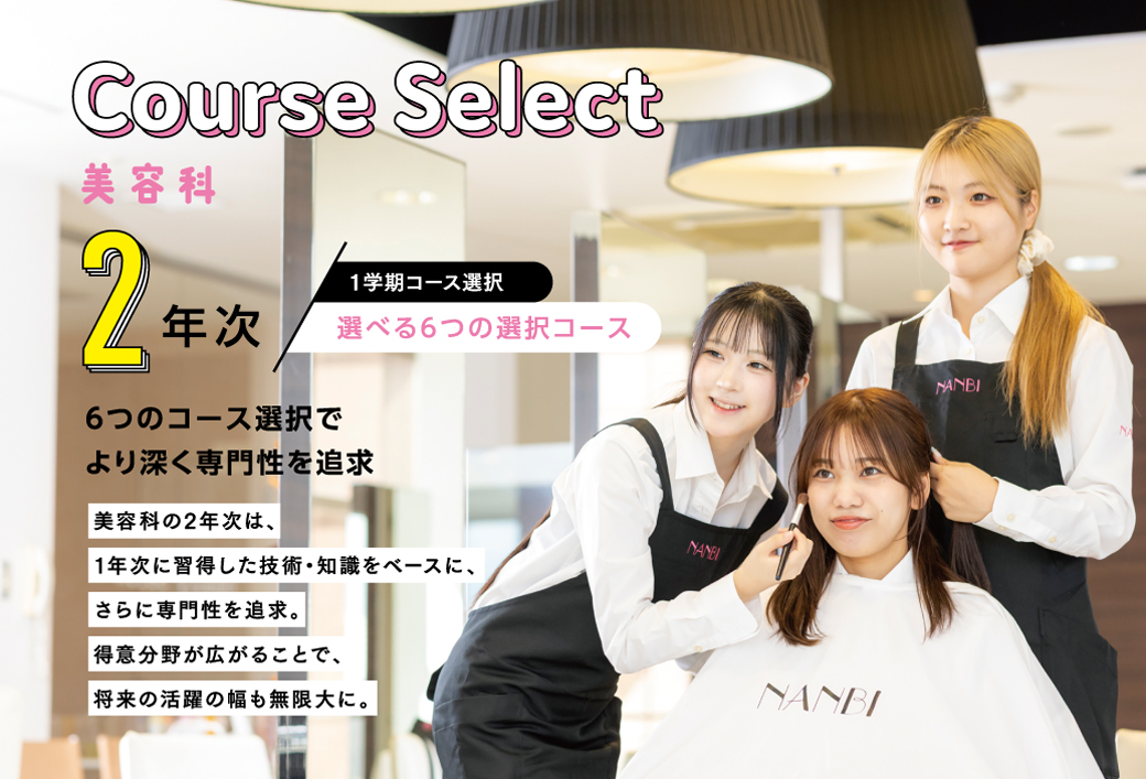 美容科の2年次は、1年次に習得した技術・知識をベースに、さらに専門性を追求。 得意分野が広がることで、将来の活躍の幅も無限大に。