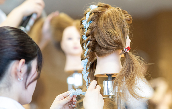 ヘアスタイル・アレンジ構成について基礎から応用まで実践的な技術を学びます。ブライダルなどで求められるヘアアレンジを幅広く学習します。