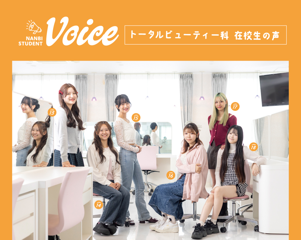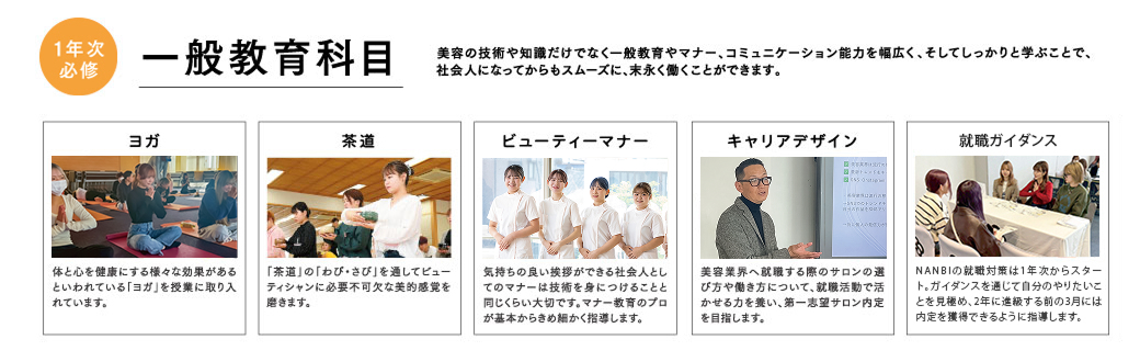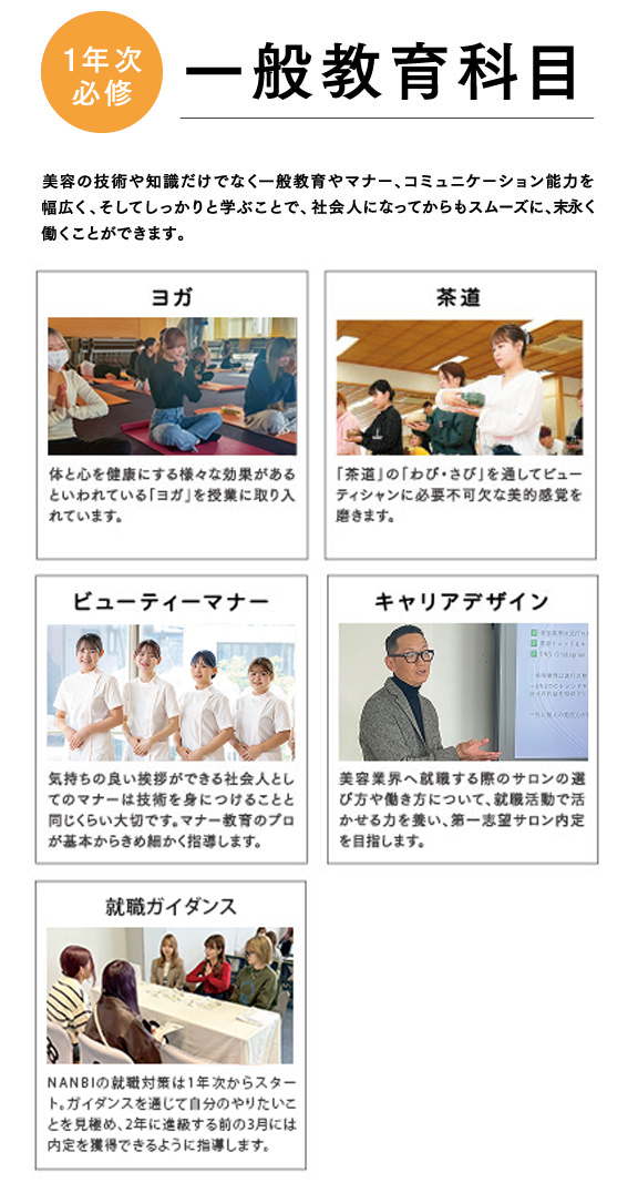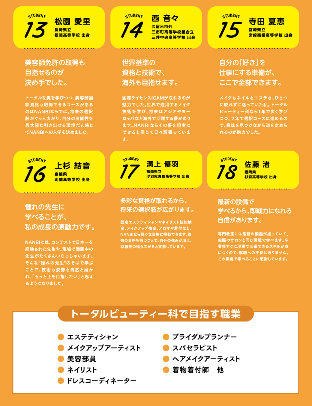 メイク、ネイル、エステ、ブライダル、着付など幅広い知識と技術をトータルに学びながらビューティシャンとしての視野を広げ、2年次にはより専門的に学びたいことを見極めて講座を選択、即戦力となるプロを育成します。また、挨拶や言葉遣い等の社会人マナーも2年間でしっかりと身につけます。