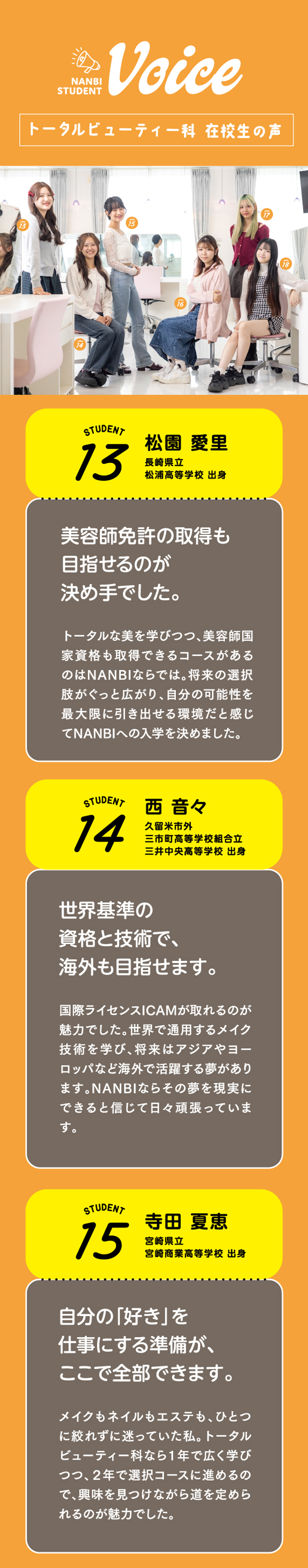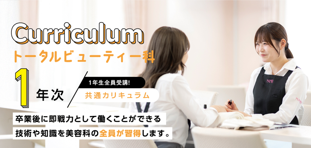 「ネイルもメイクもエステもブライダルも同じくらい興味があるから進路を一つに絞れない」。そんな方にはトータルビューティー科がおすすめです。1年次はエステ、メイク、ネイル、ブライダルの基礎を幅広く学ぶので、多彩な美容技術を習得しながら自分が進みたい道を見極める1年になります。